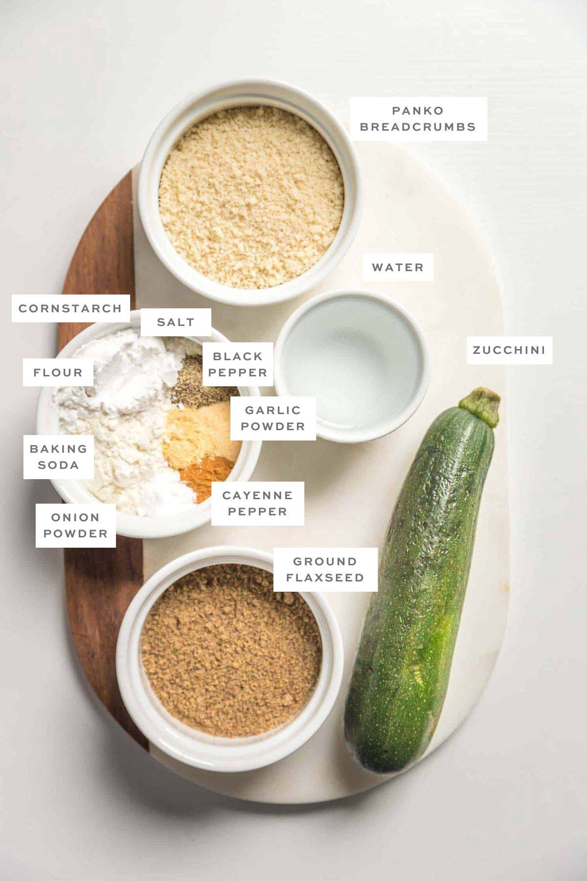 Usually they are made with four ingredients––zucchini, flour (or cornstarch), a binder (we used a flax egg), and breading. The zucchini is dredged in seasoned flour, dipped in the binder, and then the breading (usually bread crumbs) is added for a crispy crust.