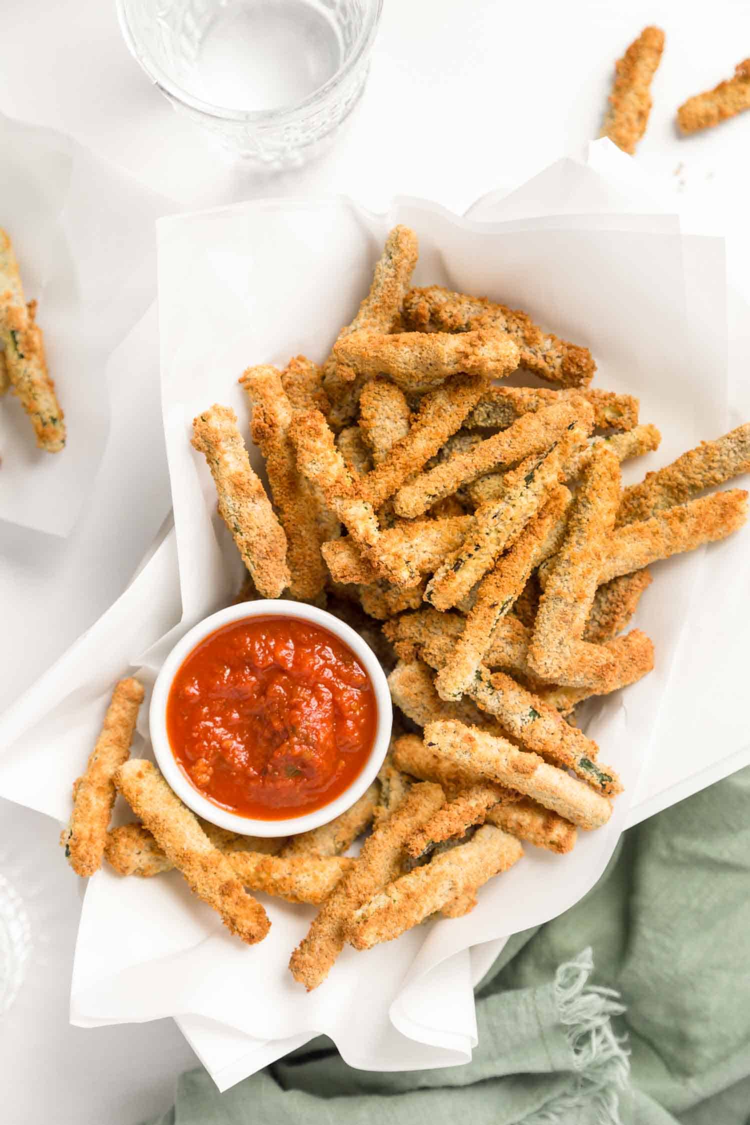 Basket of air fryer zucchini fries With Marinara Sauce Dip