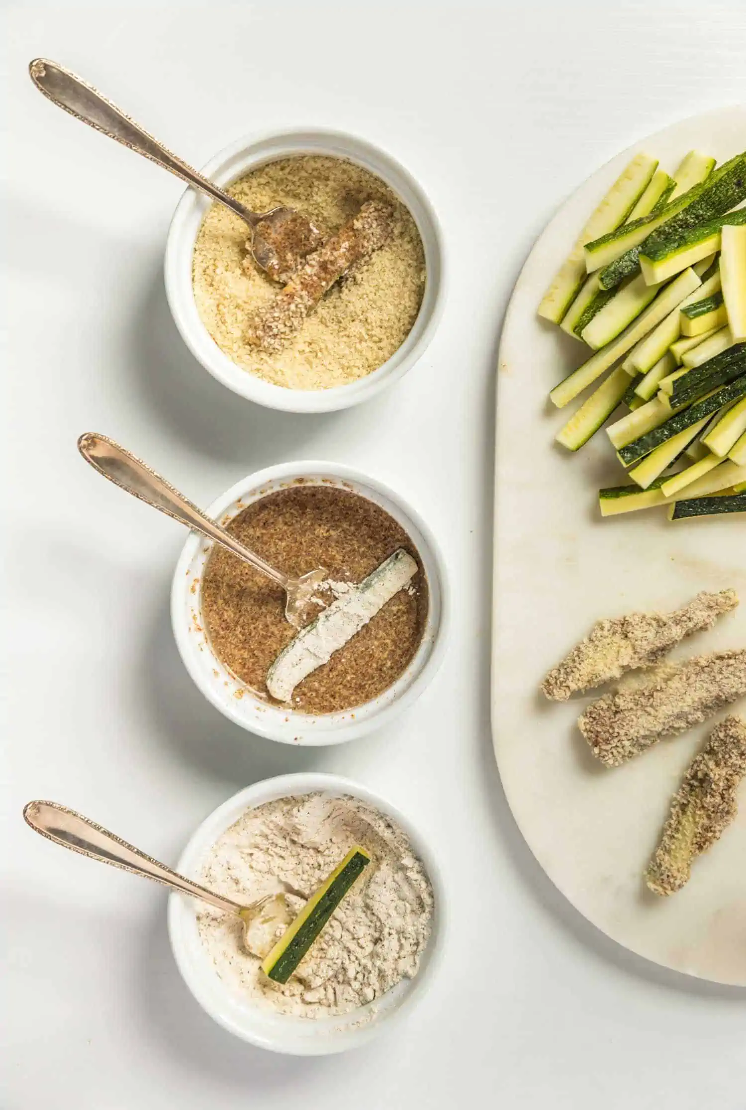Although it may seem like there’s a lot to collect to create this recipe, it’s actually pretty simple once you have them assembled. Just measure out your ingredients and set out a station with three bowls, three forks, and your veggie pieces. Whether you’re aiming to make air fryer zucchini chips, zucchini sticks, or courgette fries (another name for zucchini), they’ll all come out amazing in the air fryer.