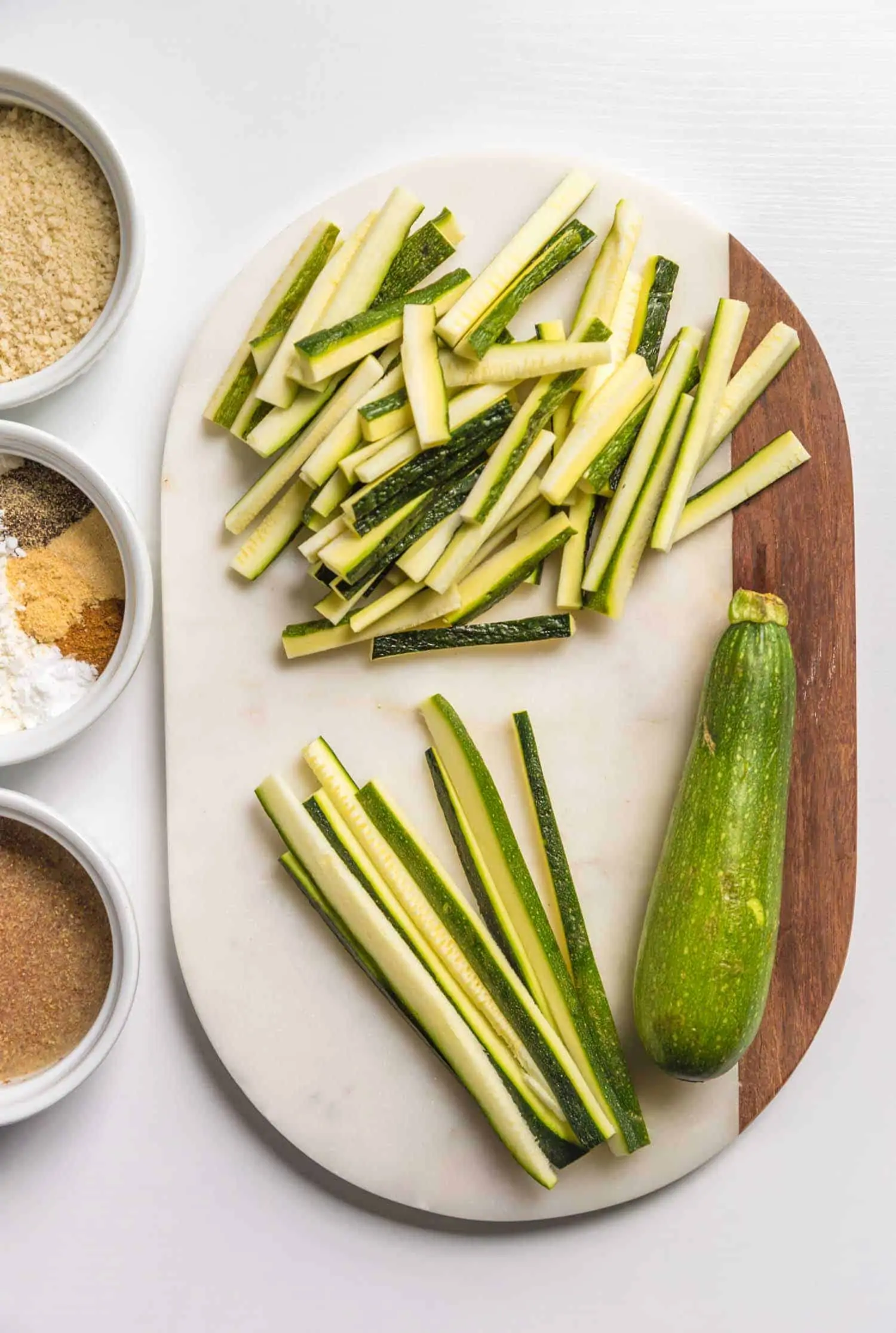 To create the right shape for making air fryer zucchini, the key is to pay attention to the thickness. Less than ½” seems to work the best. Any thicker and the zucchini is too juicy and not crisp enough, while a thinner slice creates a tough texture that no longer resembles a plant-based mozzarella stick.