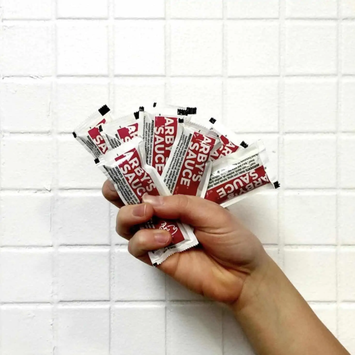 A hand holding many packets of accidentally vegan Arby's sauce.