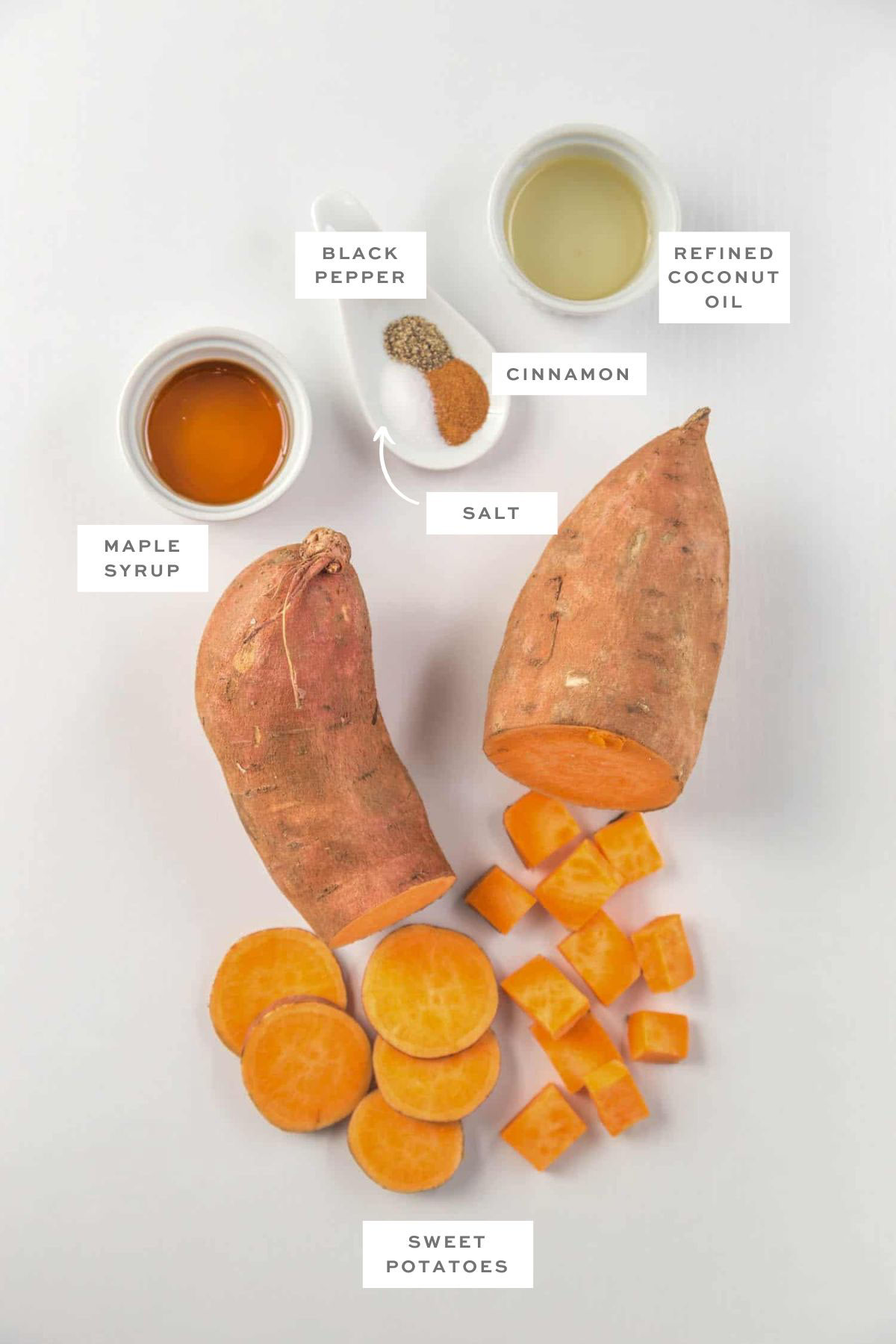 You only need a handful of simple, pantry-friendly ingredients to make these perfectly roasted, slightly caramelized sweet potato slices. No complicated spice blends, no hard-to-find oils—just a few essentials that let the natural sweetness of the potatoes shine. Here’s what you’ll need: