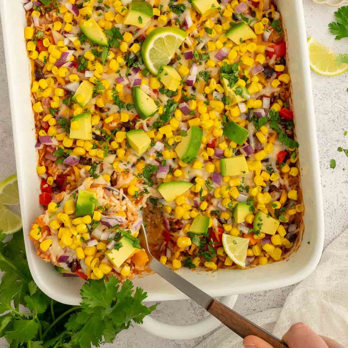 A large casserole dish of black bean and rice casserole topped with Mexican-style toppings like cilantro, red onion, cilantro, avocado, corn, and lime slices.