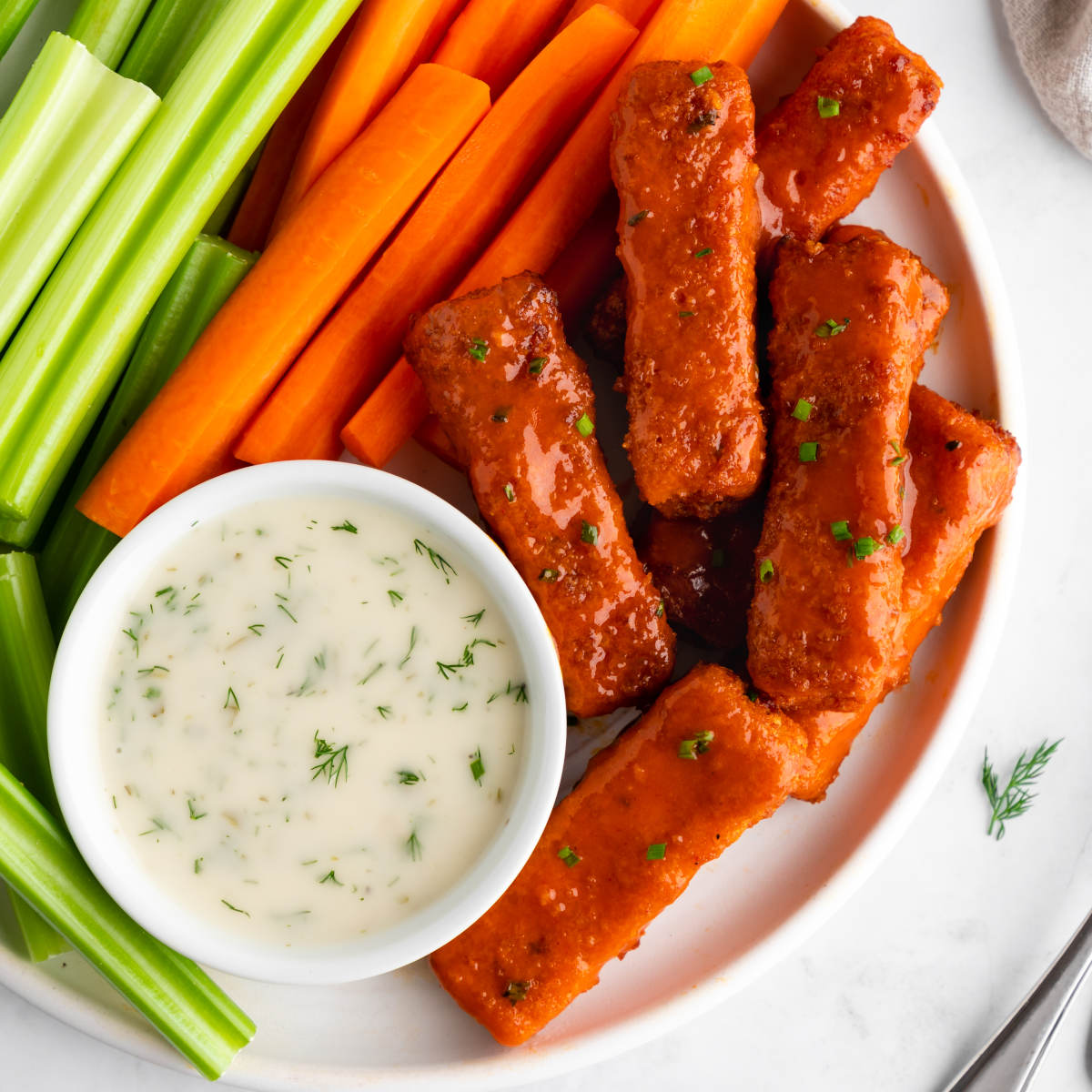 Vegan buffalo wings on a plate with vegan ranch and veggie sticks.