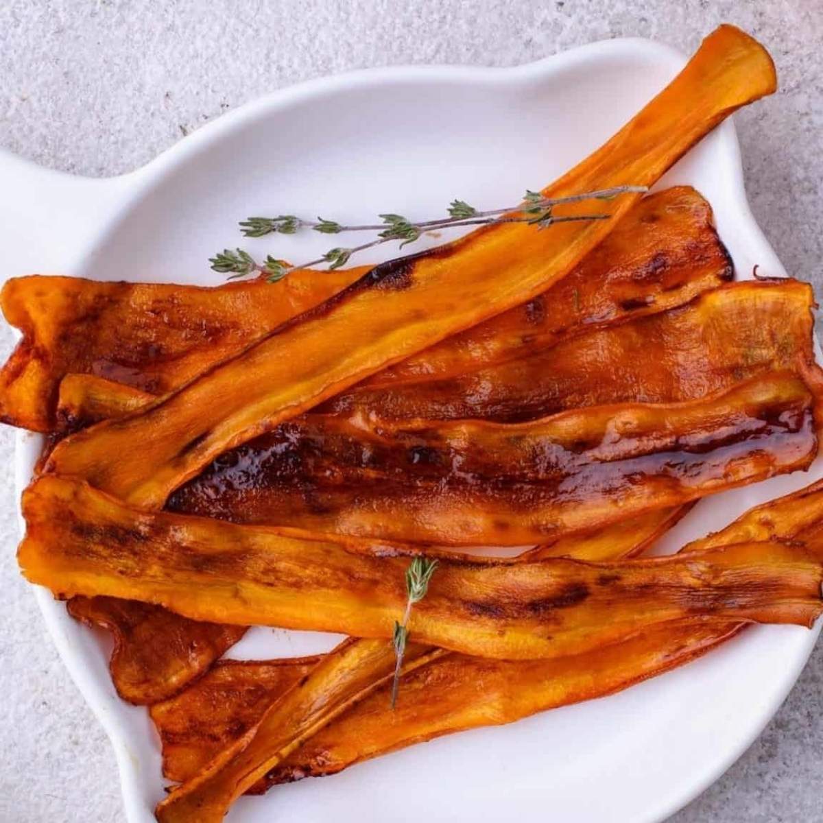 Carrot bacon has a smoky, savory flavor with a hint of sweetness from the marinade. The texture is crispy on the edges and slightly chewy in the center, making it a delicious stand-in for traditional bacon. It’s the perfect blend of salty, smoky, and satisfying.