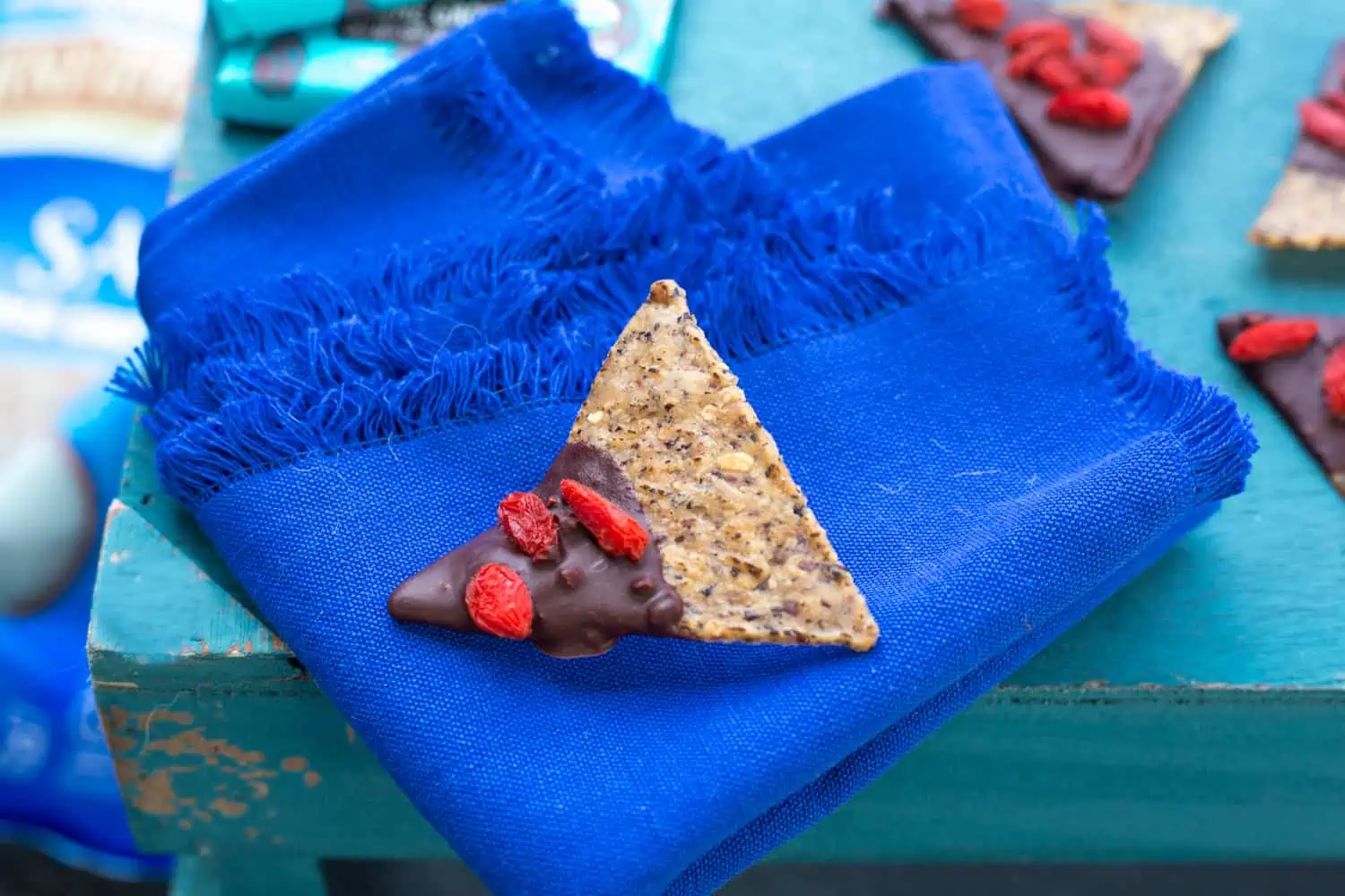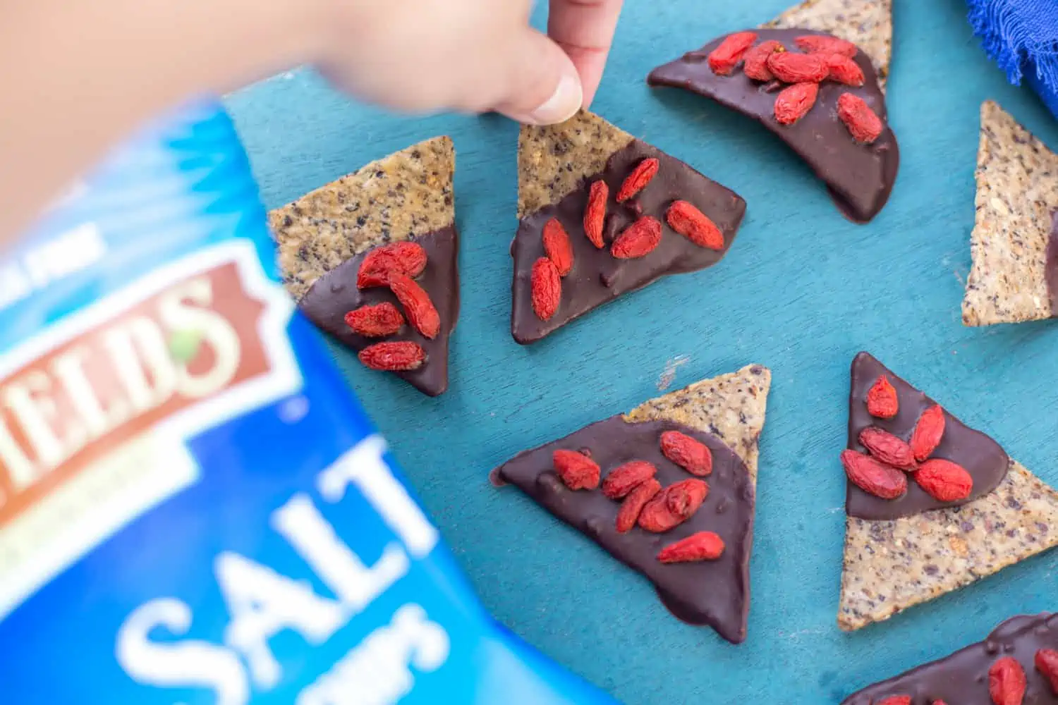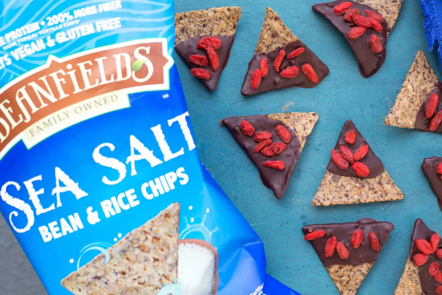 We’re starting with a base of Sea Salt Bean and Rice Chips from Beanfields. These chips are packed with plant protein and fiber, and also happen to be non-GMO, gluten-free, and of course, vegan. Then we add a dose of antioxidants by dipping the chips in melted dark chocolate (vegan, of course). And finally, we really ramp up the health factor by sprinkling these chips with goji berries!