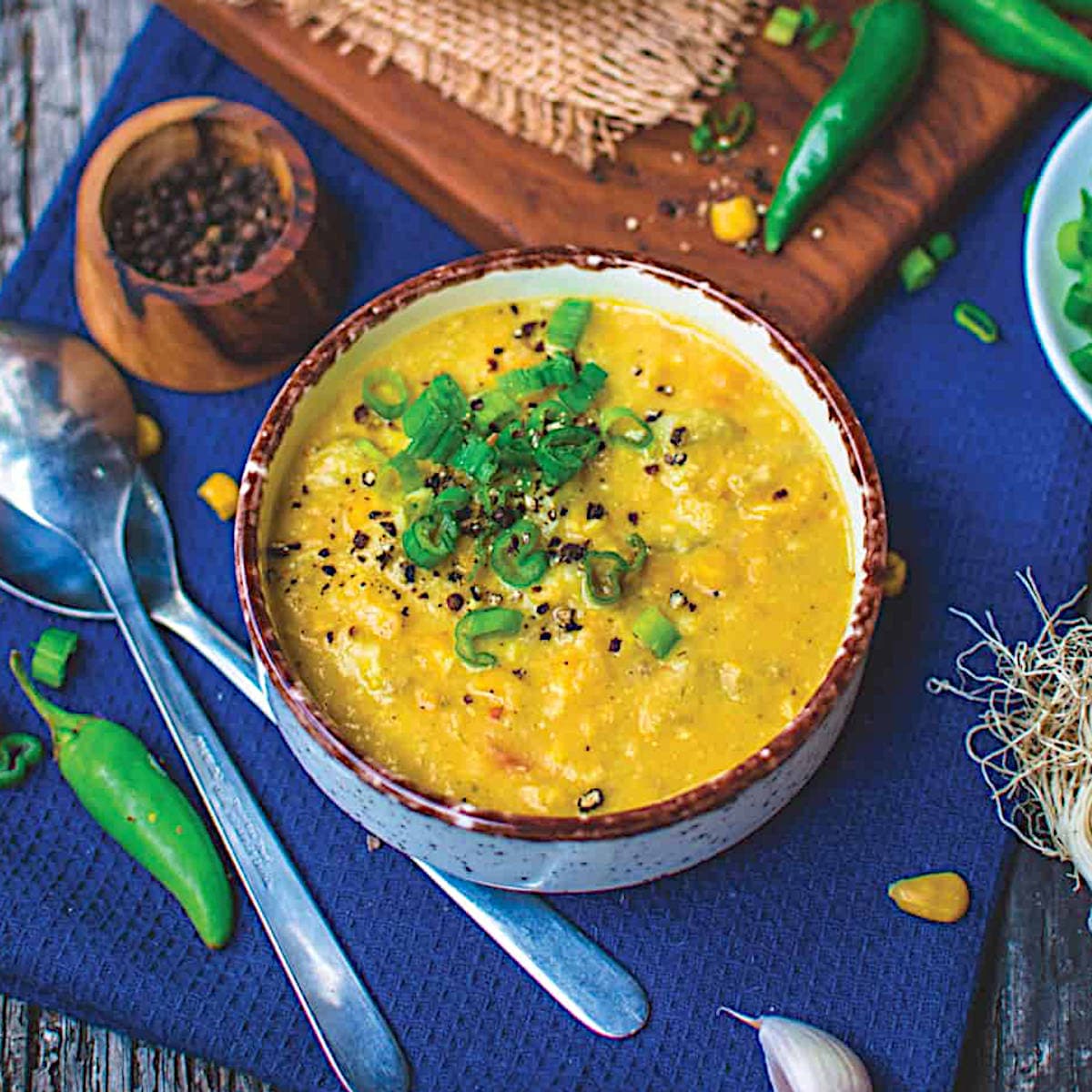 Wrapping your chilly hands around a hot bowl of this vegan corn chowder is like holding sunshine. The brilliant yellow color excites your eyes as your spoon dips into this creamy, nutrient-packed soup speckled with little bits of corn, potatoes, bell pepper, onion, and celery. Your first bite begins to warm you from the inside out. Soup perfection!