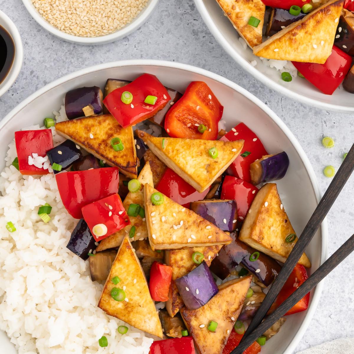It’s really easy to store any remaining tofu and eggplant stir-fry. Add leftovers to a separate container from the noodles or rice (if possible), cover, and place in the fridge for up to 3 days. Not recommended for freezing.