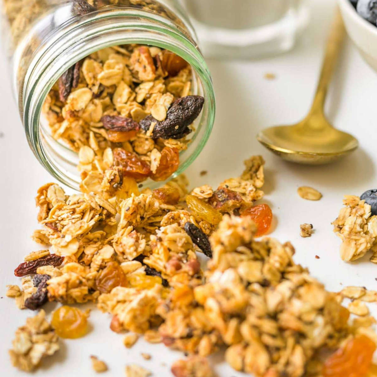 Step 3: Sprinkle raisins and goji berries over the top without stirring, and allow the granola to cool for 1 hour. Although initially soft, the granola will firm up as it cools. Store in a sealed container in your pantry until ready to enjoy.
