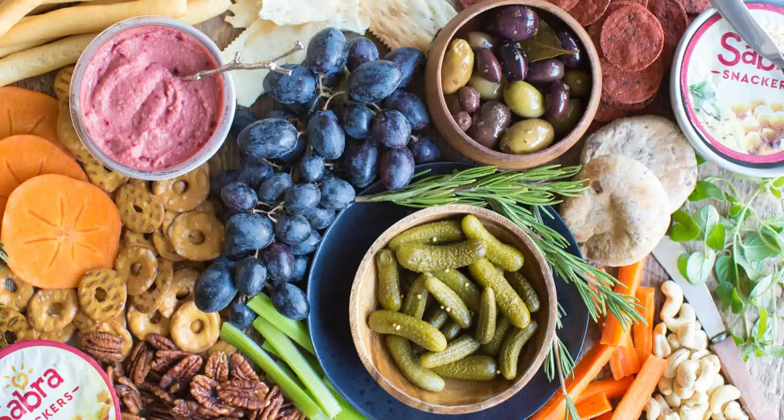 Below you’ll find items that go great on a hummus board—but none are necessities. Pick a few of your favorites and work with those! You likely already have many of these ingredients in your pantry.