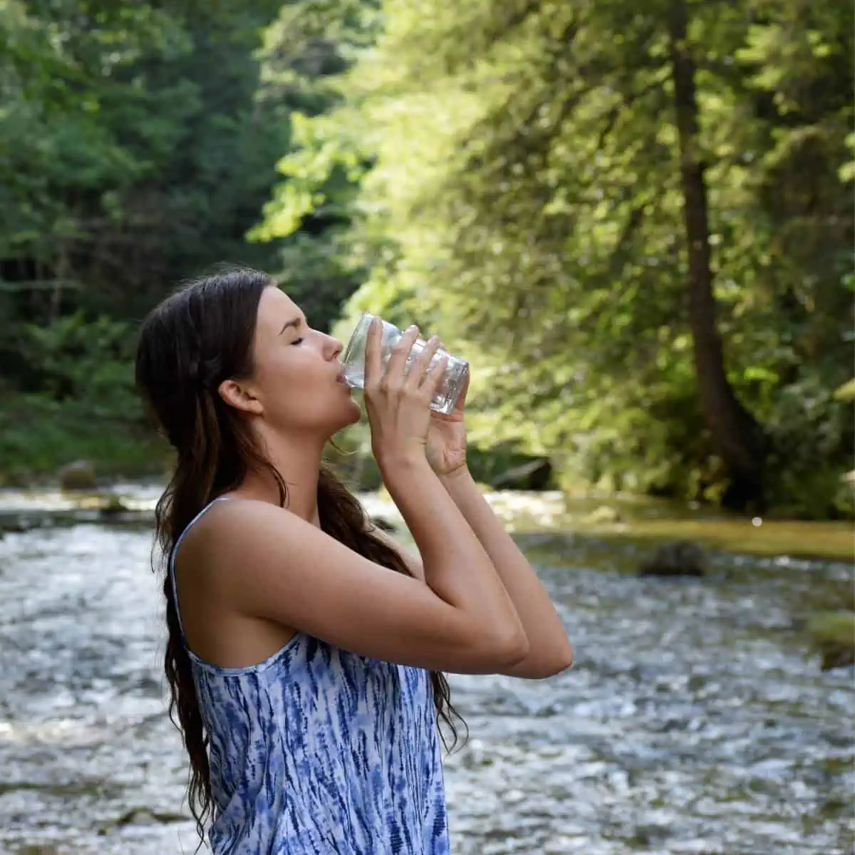 Woman drinking a glass of fresh water in a forest wondering if water is vegan.