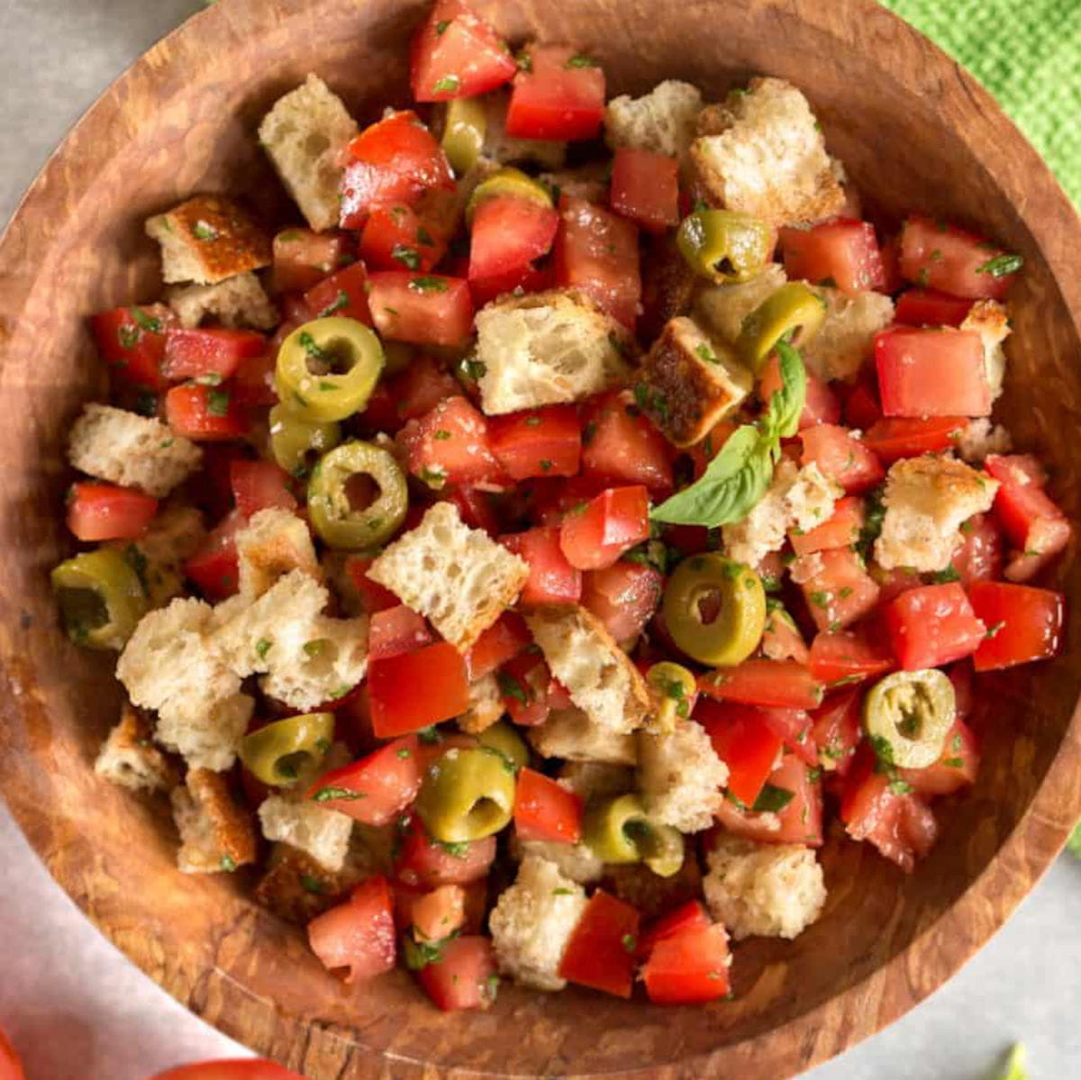 Enjoy the best flavors of the Mediterranean—juicy vine-ripened tomatoes, savory brine-cured olives, and fresh basil—in this classic Italian tomato salad. It’s like a deconstructed bruschetta salad, or some may call it a bread salad. The red wine vinegar and extra virgin olive oil marries the flavors beautifully, and of course, no Italian dish would be complete without a hearty dose of bread!