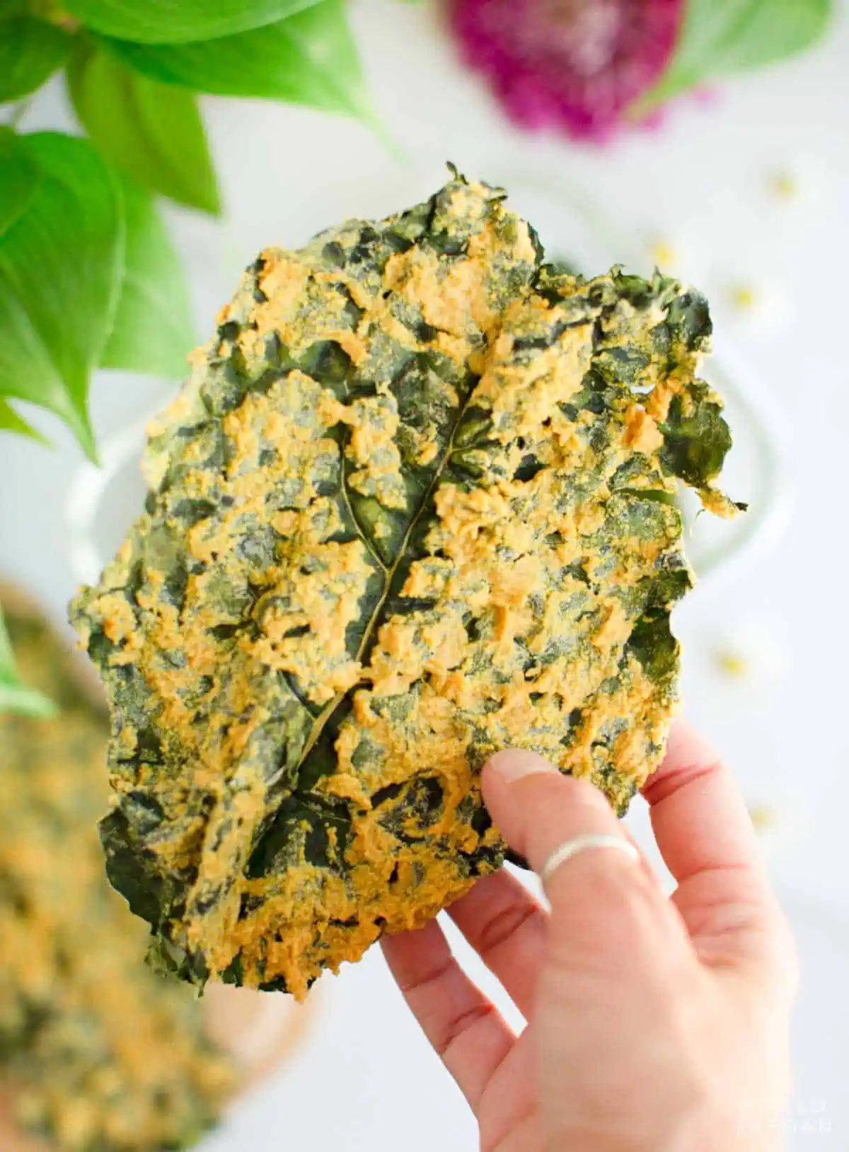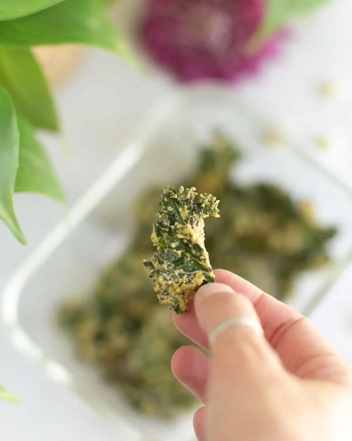 holding up a dehydrated kale chip