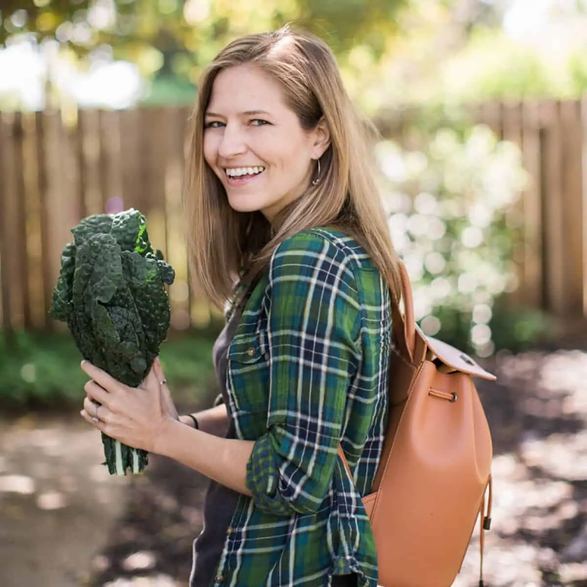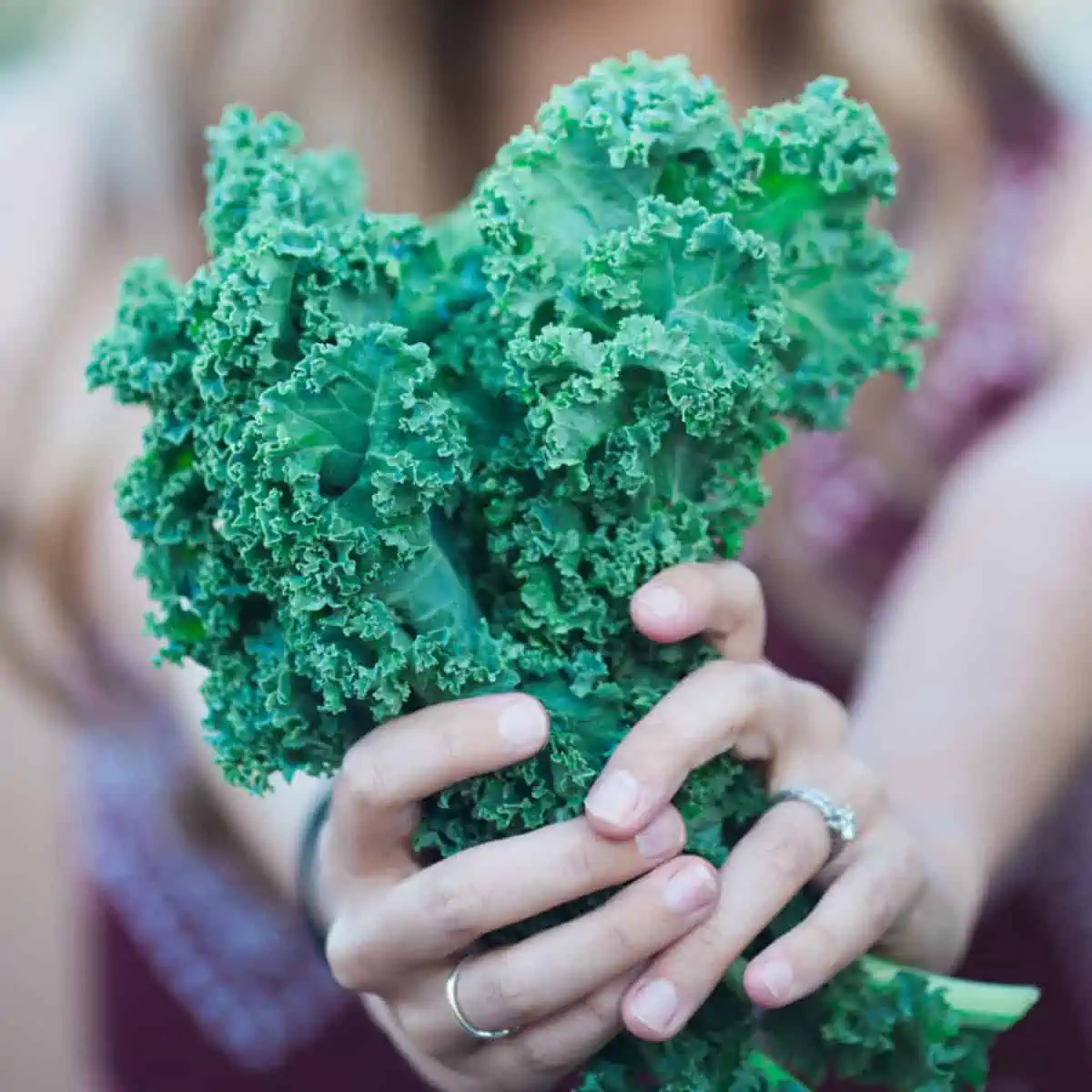 Michelle Cehn holding out a bunch of curly kale
