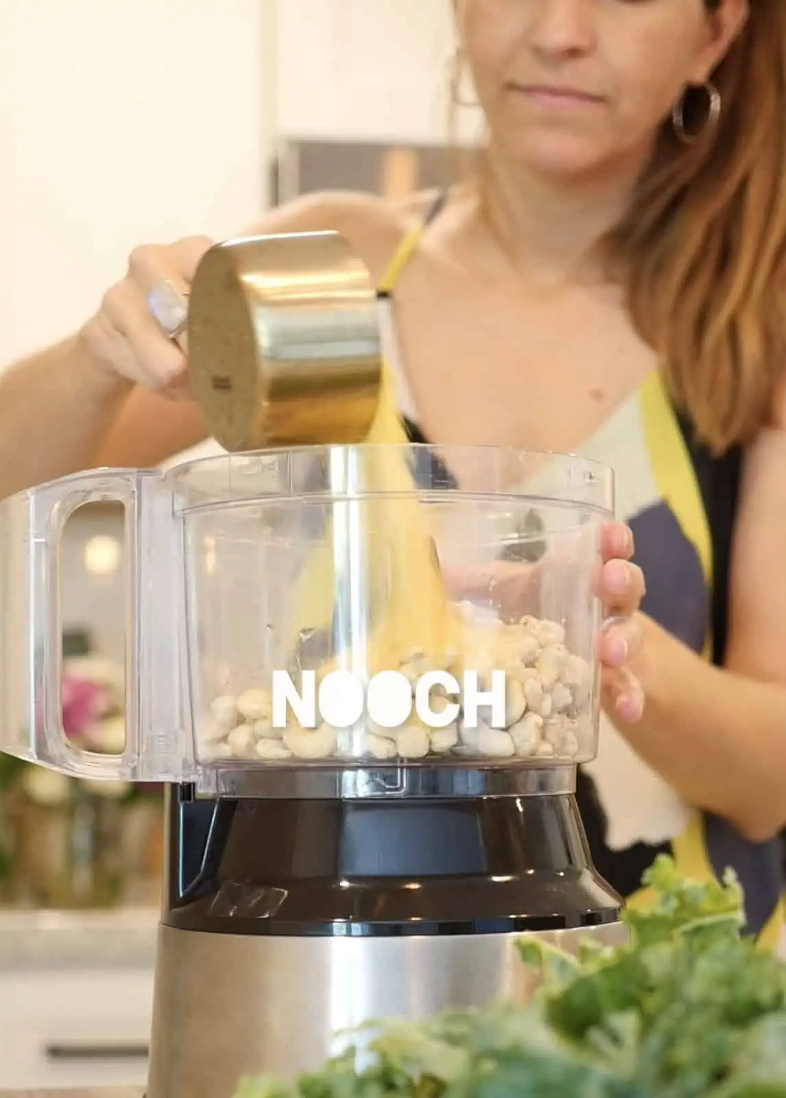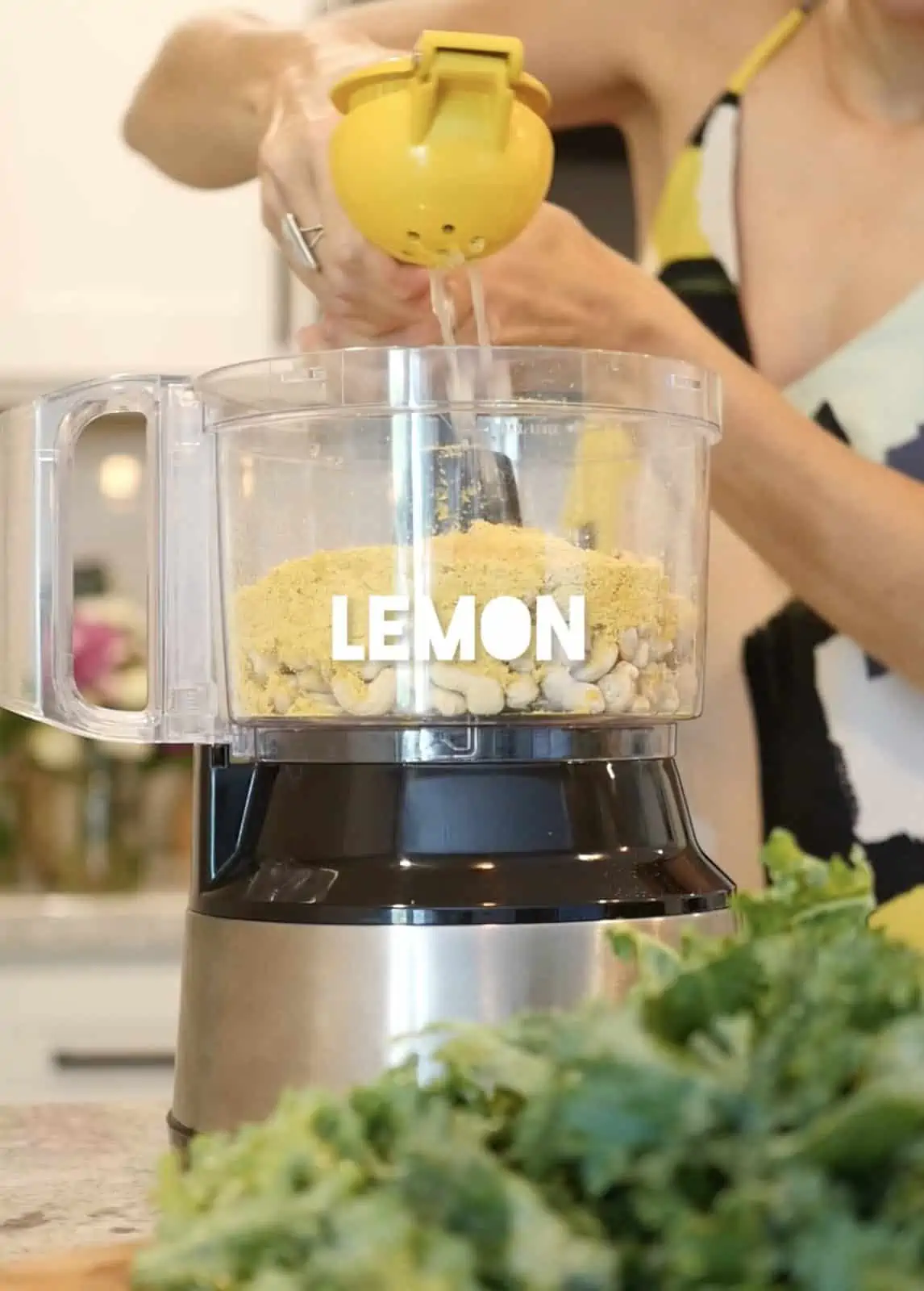 Add the nuts, nooch, freshly squeezed lemon juice, oil, onion, and spices to your food processor and blend into a paste. It’s okay if it’s a little chunky, but if you’re unsure if it’s done, blend a little longer.