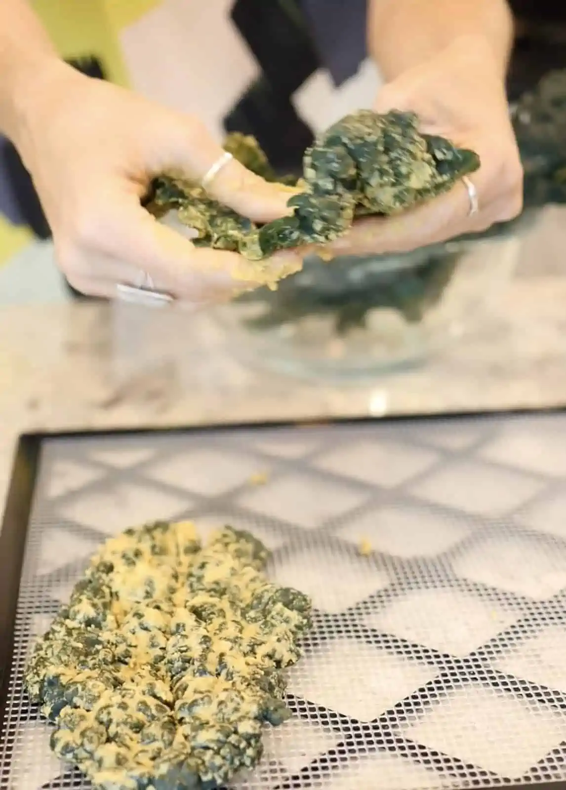 Lay the coated kale pieces flat in a single layer on the dehydrator trays and voila! You’re ready to dehydrate!