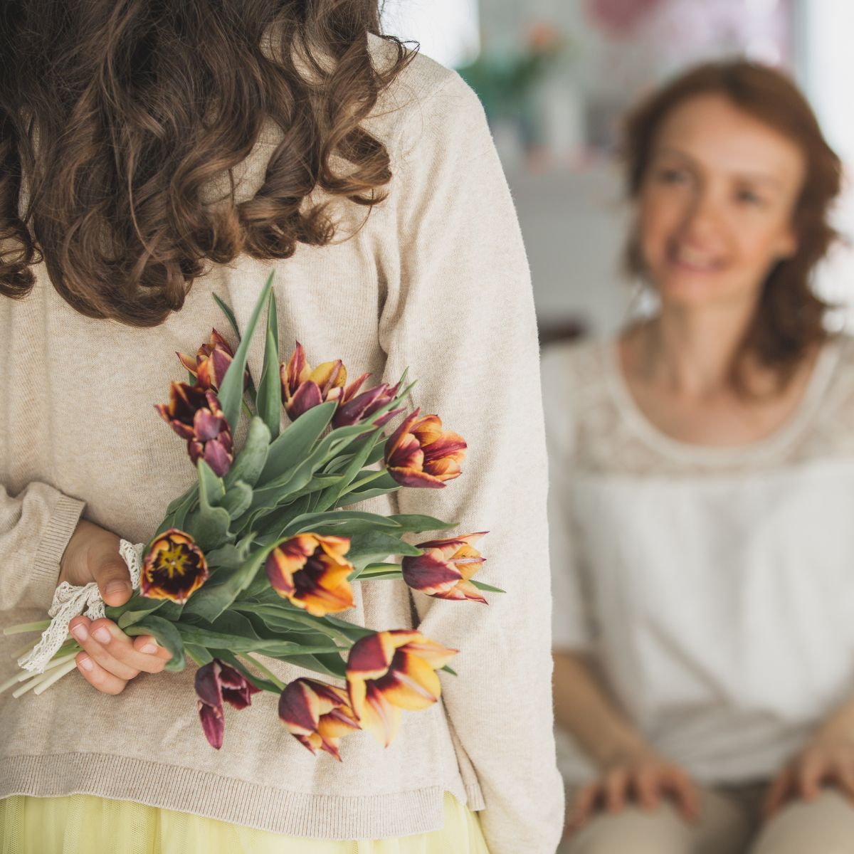 A daughter bringing her mother a gift of flowers.