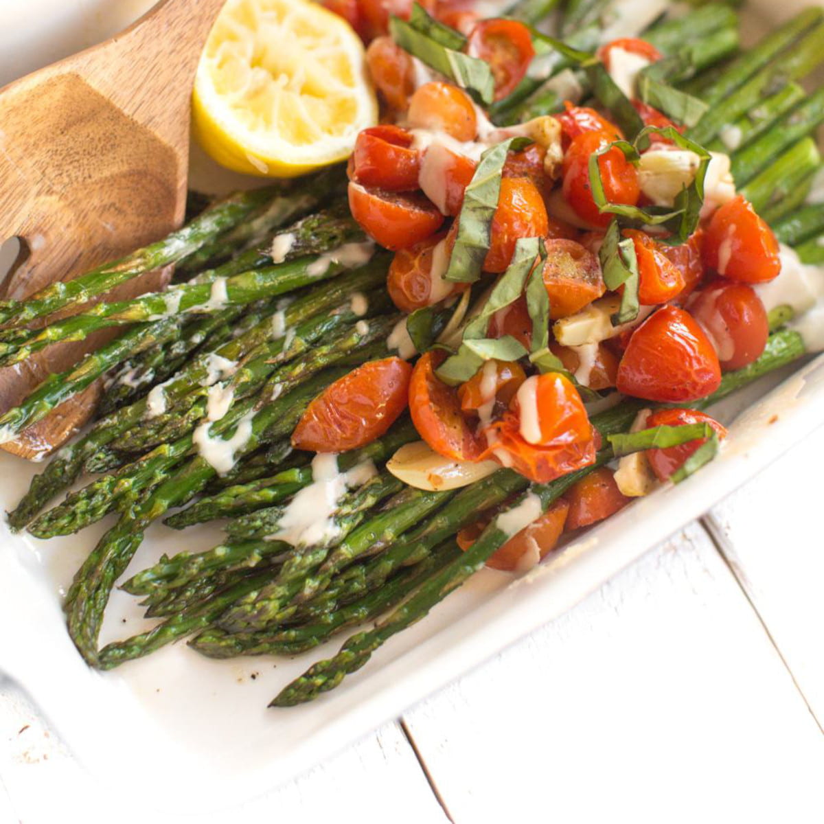 Roasted asparagus and tomatoes with tahini drizzle in a serving dish with a wooden spoon.