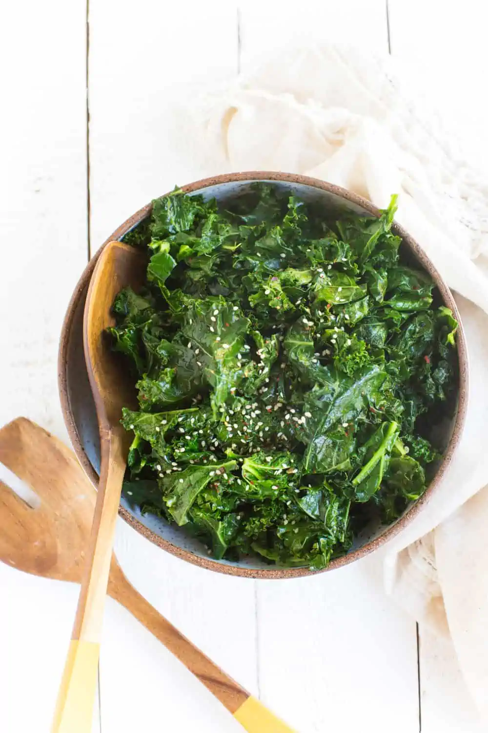 This simple sautéed kale with garlic & sesame is widely loved in my house—it's one of my all-time favorite ways to enjoy curly kale. The toasted sesame oil gives it a savory depth of Asian-inspired flavor while the garlic, salt, and red pepper flakes give it a nice spicy kick. Add in some white or black sesame seeds for show (and also some added nutrients—like calcium), and voila! You've got a beautiful green side dish that's so good that even the kids will be begging for more.