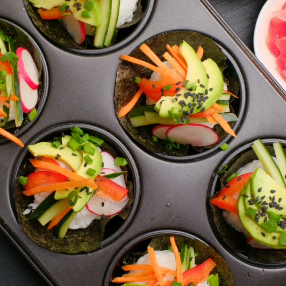 Step 7: Garnish and Serve – Garnish sushi cupcakes with thinly sliced vegetables and sprinkle with black sesame seeds. Serve with soy sauce, wasabi (if using), pickled ginger, and the dipping sauce on the side.