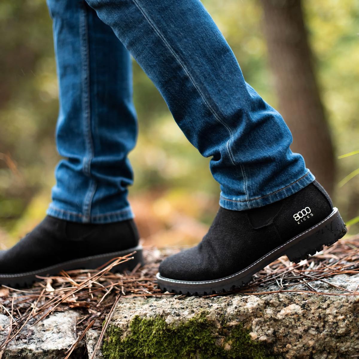 Black hemp chelsea boots in the woods from 8000 Kicks brand.