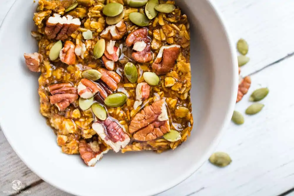 If warm porridge isn’t your thing, give oats another try by baking them. You’ll discover that the result is more akin to a breakfast bar. Baked oats (like this delicious pumpkin baked oatmeal perfect for fall) are easily customizable by varying the nuts, seeds, spices, and fruit. Top with a drizzle of maple syrup and breakfast is served! Hurray for more vegan breakfast ideas!