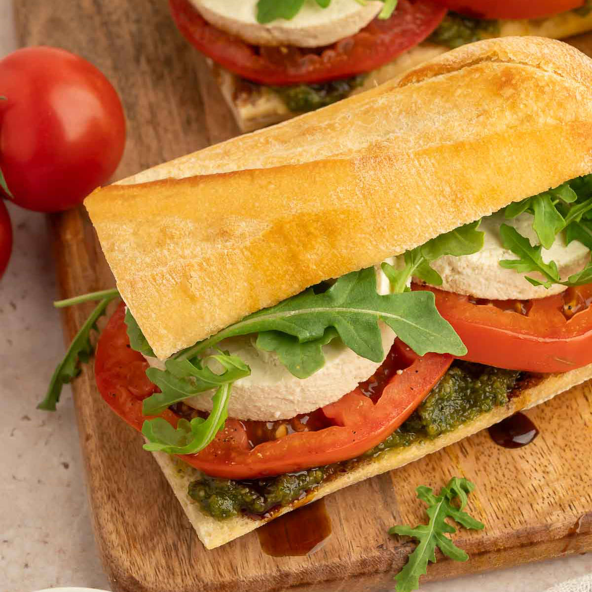 Our vegan pesto caprese sandwich gets its amazing flavor from key ingredients like fresh French bread, bold pesto, tofu “mozzarella”, and balsamic glaze. If you’re out of something, easy swaps like ciabatta bread, spinach, or homemade cashew cheese can save the day! Here’s what you’ll need: