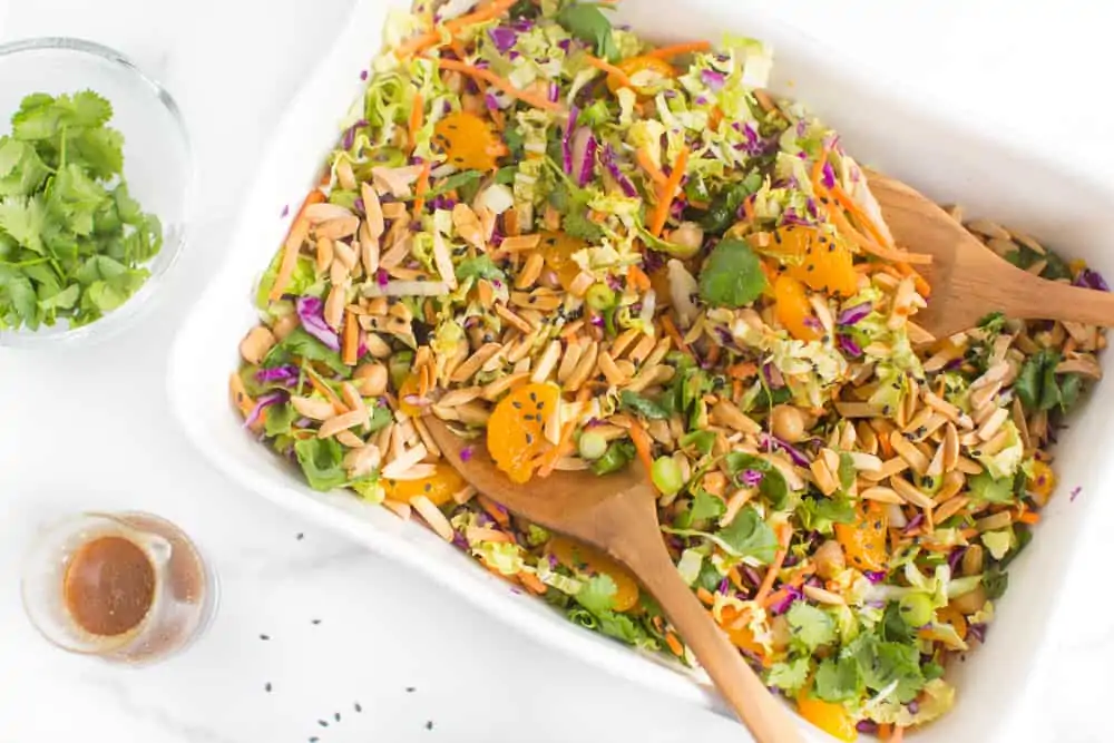 If you’re a lover of California Pizza Kitchen’s Chinese Chicken Salad, you’ll love this copycat recipe made using chickpeas instead of chicken! It’s fully veganized and really easy to make, with those classic delicious sweet-and-savory sesame infused flavors.