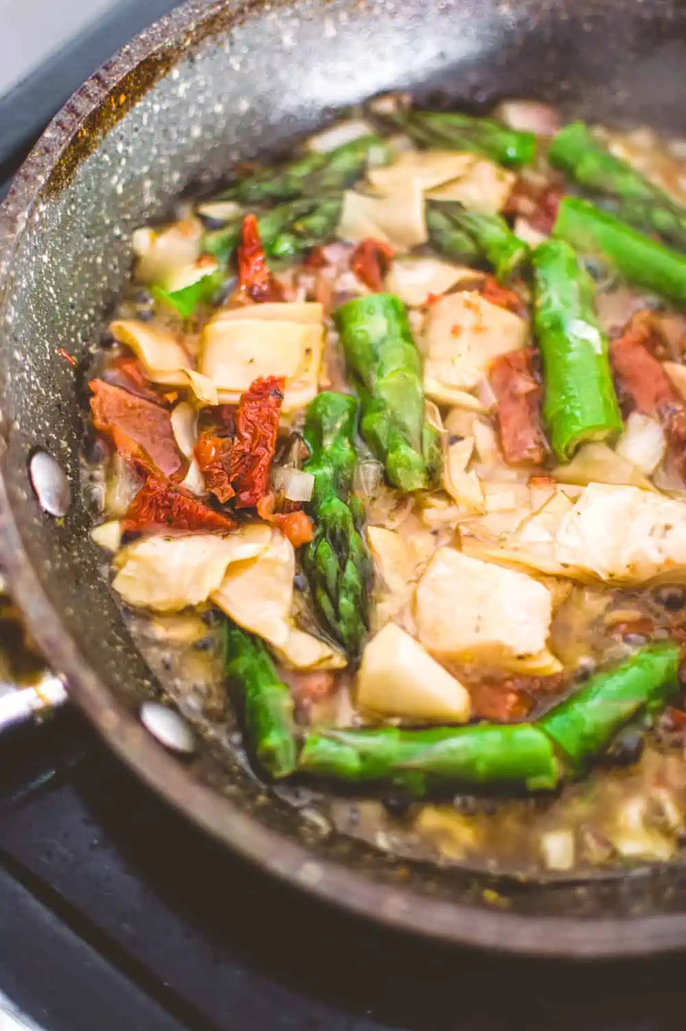 • Heat the broth in a medium sauté pan. Add the onion and garlic. Stir in the asparagus, tomatoes, and artichoke hearts. Cook for 3-4 minutes.