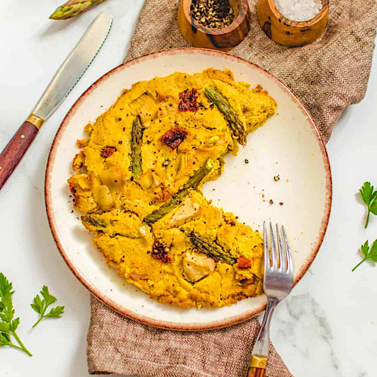 Vegan frittata with asparagus, artichokes, and sun-dried tomatoes on a plate with a slice missing.
