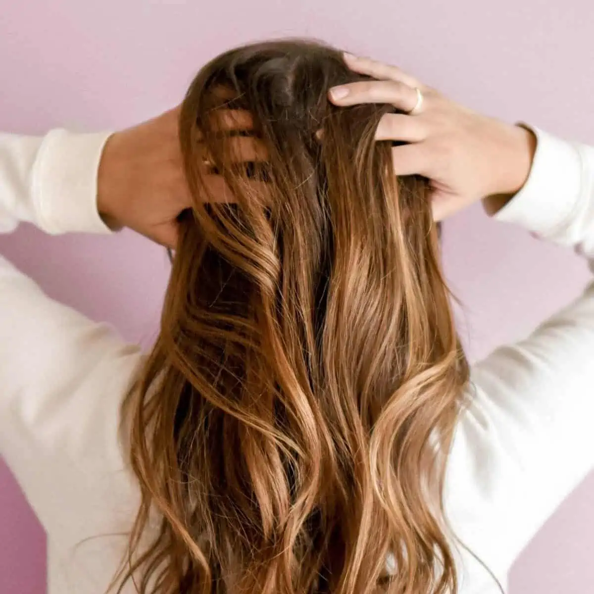girls with hands in her brown wavy hair loss