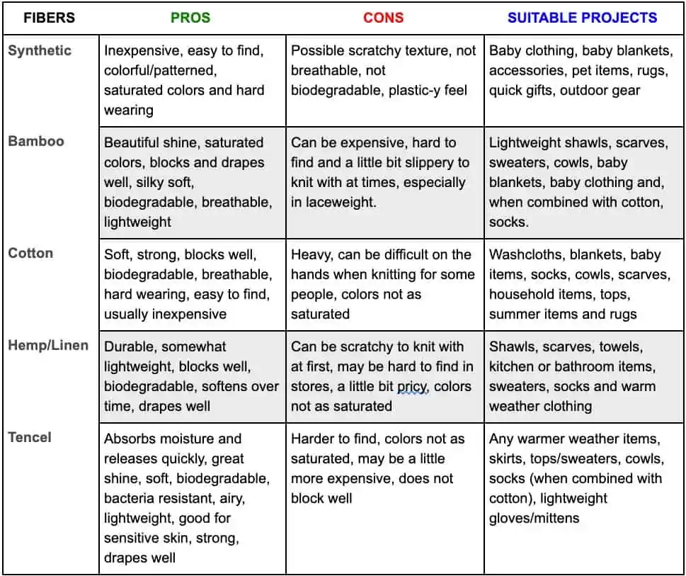 Once you know which yarns to avoid, you can concentrate on the good stuff: all the amazing plant fibers you can knit with. This chart can help you choose the right yarn for the right project.