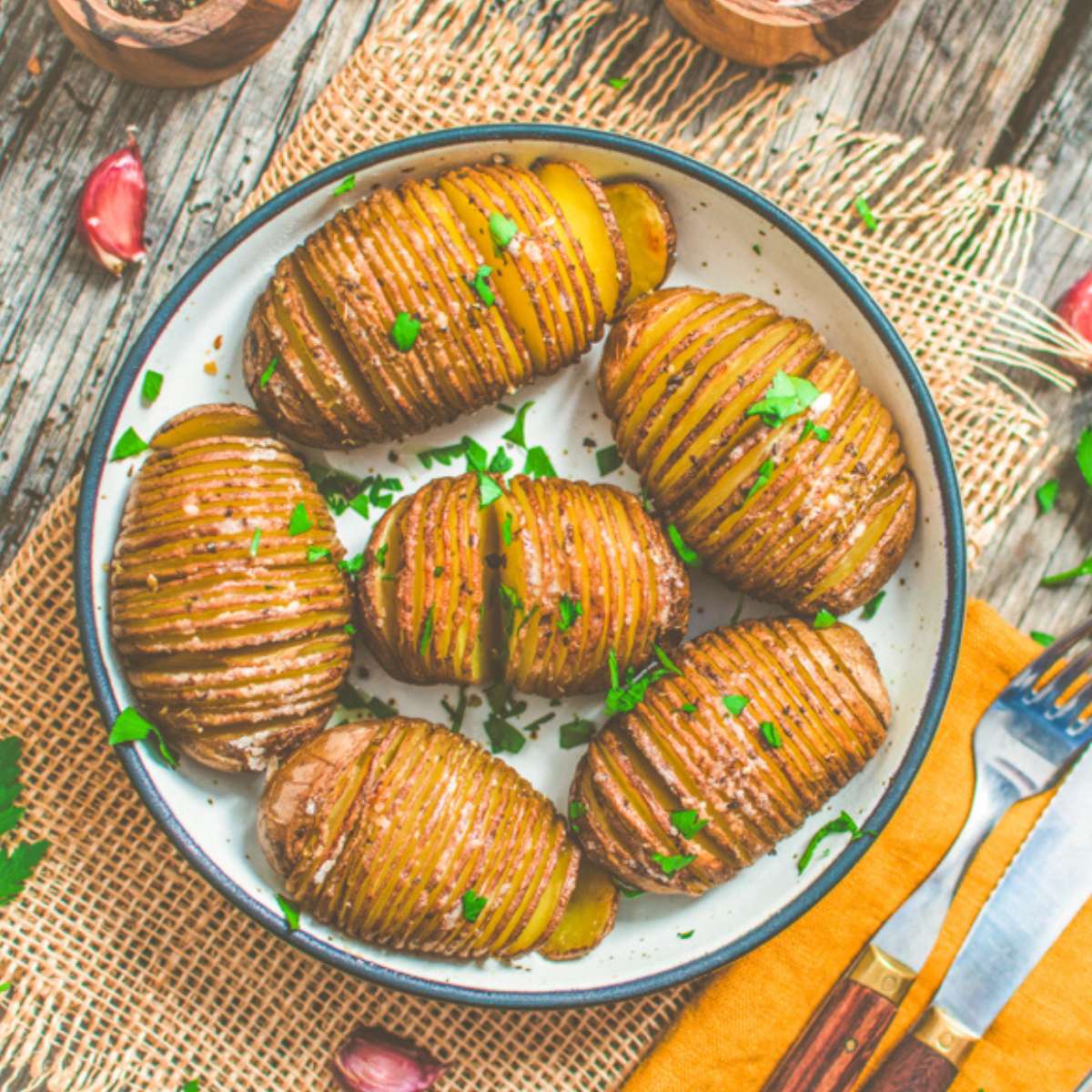 Vegan potatoes, Hasselback style, served on a platter with chopped herbs.