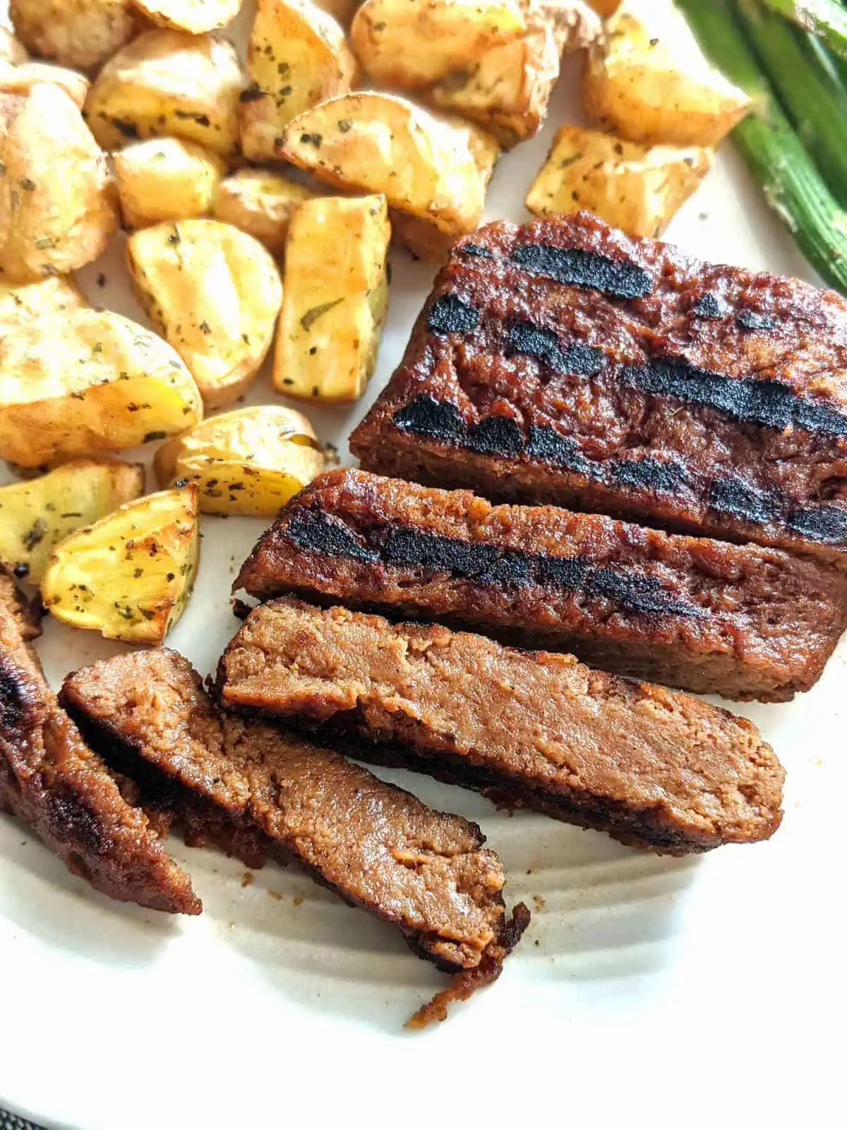 Seitan vegan steak cut into slices, on a plate with potatoes.