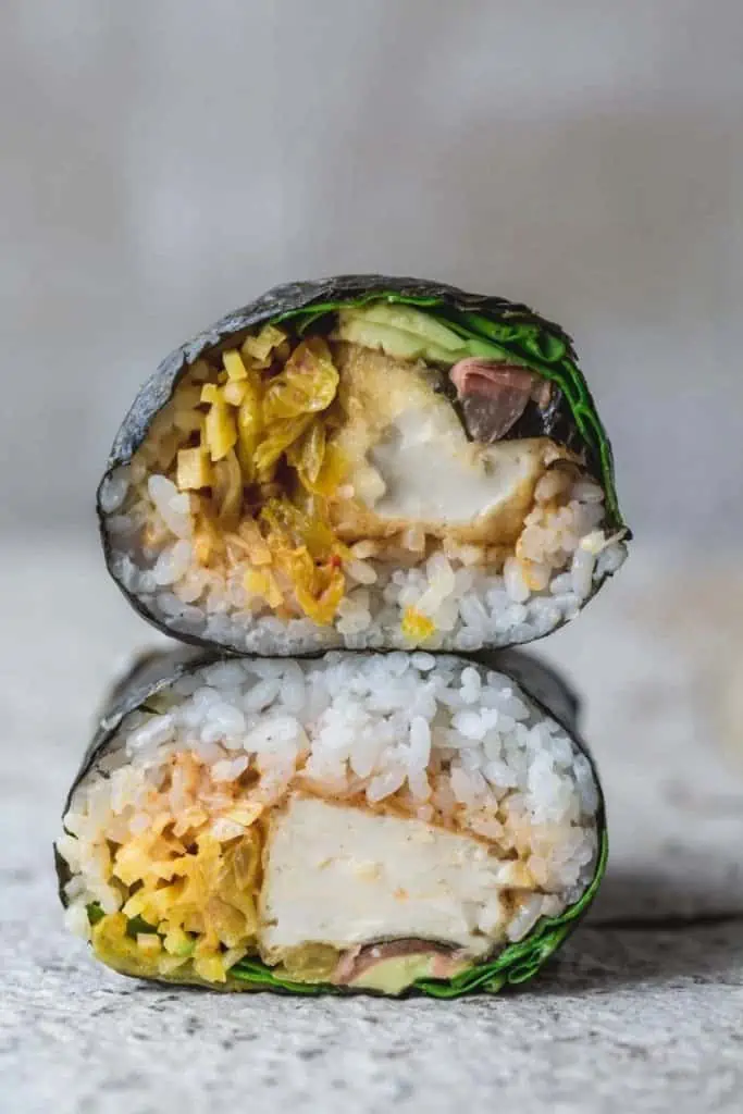 Love vegan sushi and burritos? Then look no further than this delicious vegan and gluten-free wrap recipe from My Goodness Kitchen. Steamed rice, crispy tofu, kimchi, and more all come together in a nori wrap to deliver a serious flavor party.