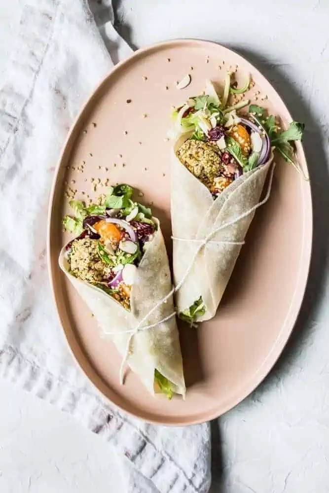 A wonderfully exciting gluten-free vegan wrap idea from Healthy Little Vittles, the magic lies in the combination of fluffy, protein-packed quinoa falafel meeting juicy, and sweet tangerines. An easy meal for lunch or dinner, the falafel is also great for prepping in advance to make assembling these wraps a real breeze.