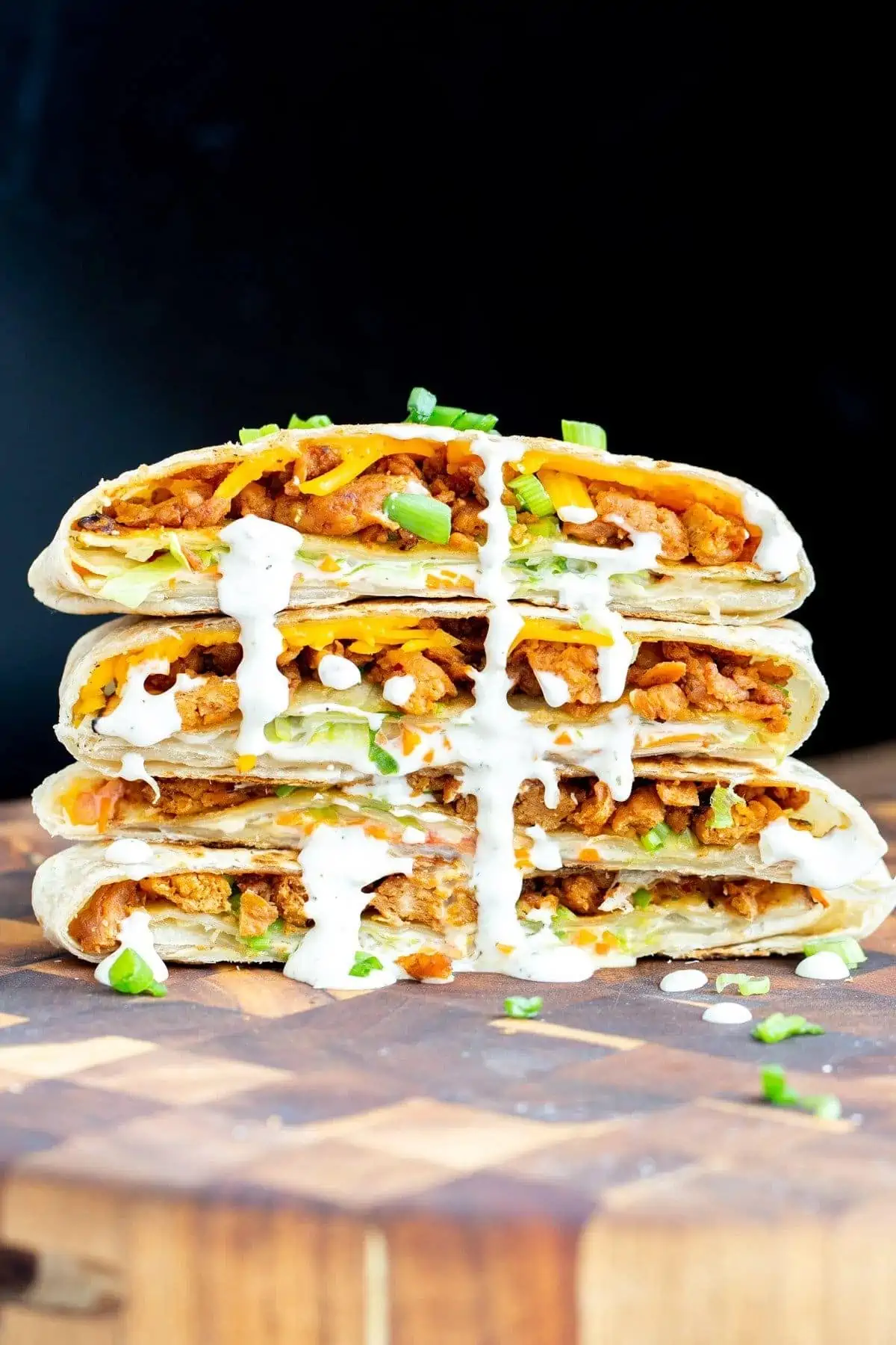 It wouldn’t be a vegan wrap roundup without a vegan crunch wrap! Let’s give a round of applause to Vegan Richa for giving us this Korean BBQ spin on the highly coveted crunch wrap. Sweet and tangy soy curls, julienned carrots, sambal oelek, and other classic Korean sauces combine forces with vegan ranch dressing and non-dairy cheese to make one heck of a vegan crunch wrap.