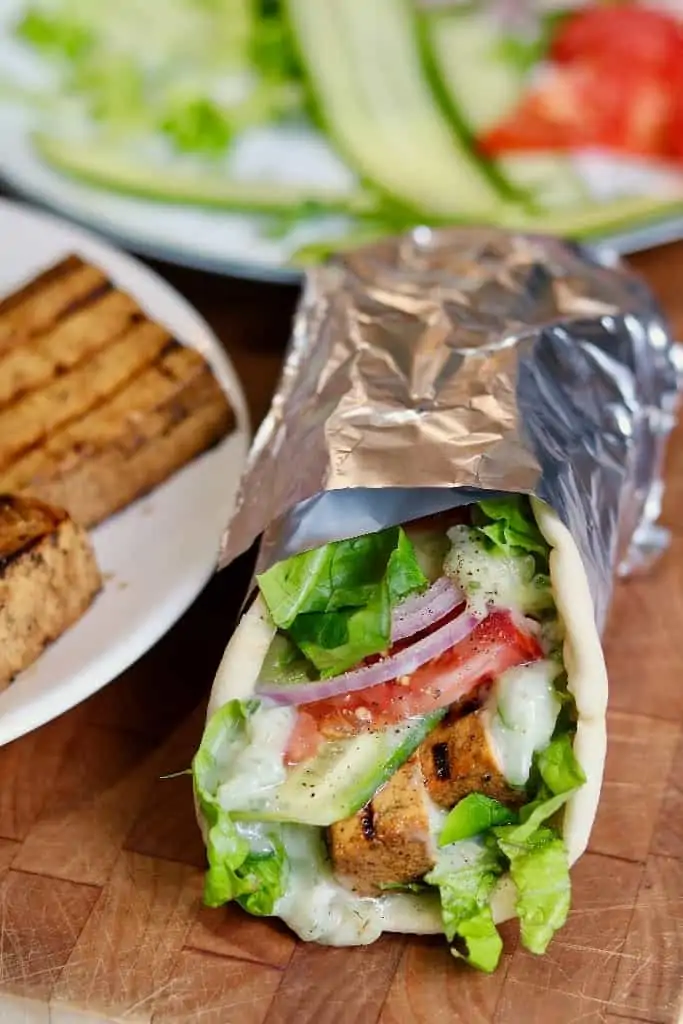 From our friends at The Cheeky Chickpea comes a super flavorful and satisfying vegan gyro recipe. The trick is in marinating the tofu in a deeply rich sauce made with ingredients such as tamari, balsamic vinegar, brown sugar, and tomato paste. We’d recommend marinating the tofu overnight for maximum flavor but it needs to sit for at least one hour. Once the tofu is ready, just grill it up and assemble the vegan gyros with fresh ingredients and vegan tzatziki sauce on a warm flatbread!