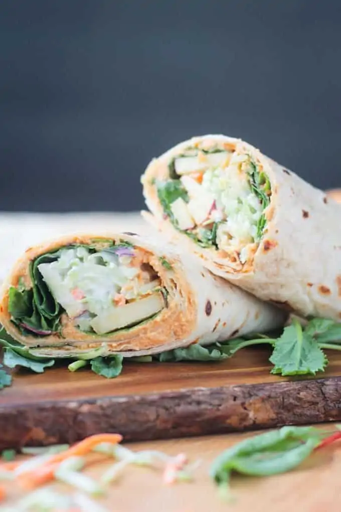 Only have a few minutes and a few ingredients on-hand? This tasty wrap recipe from Veggie Inspired is here to save the day! A creamy broccoli slaw mixed with dairy-free yogurt, spicy hummus, and some sliced apples for sweetness make this a simple yet delicious vegan wrap idea.